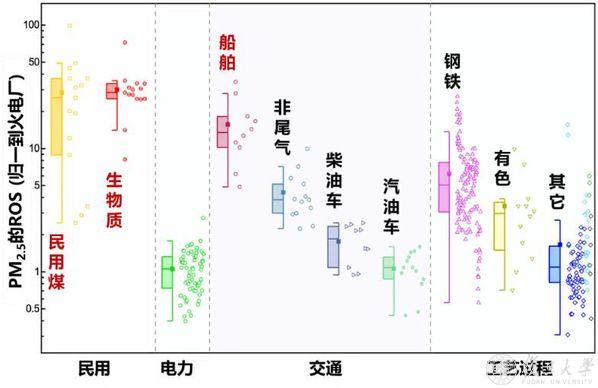 图1:主要人为源排放PM2.5的活性氧水平(ROS,归一化到火力发电行业)
